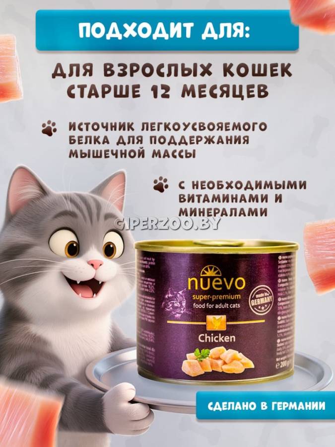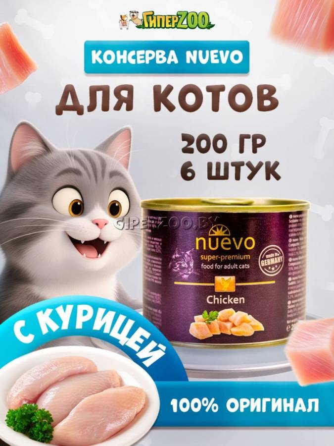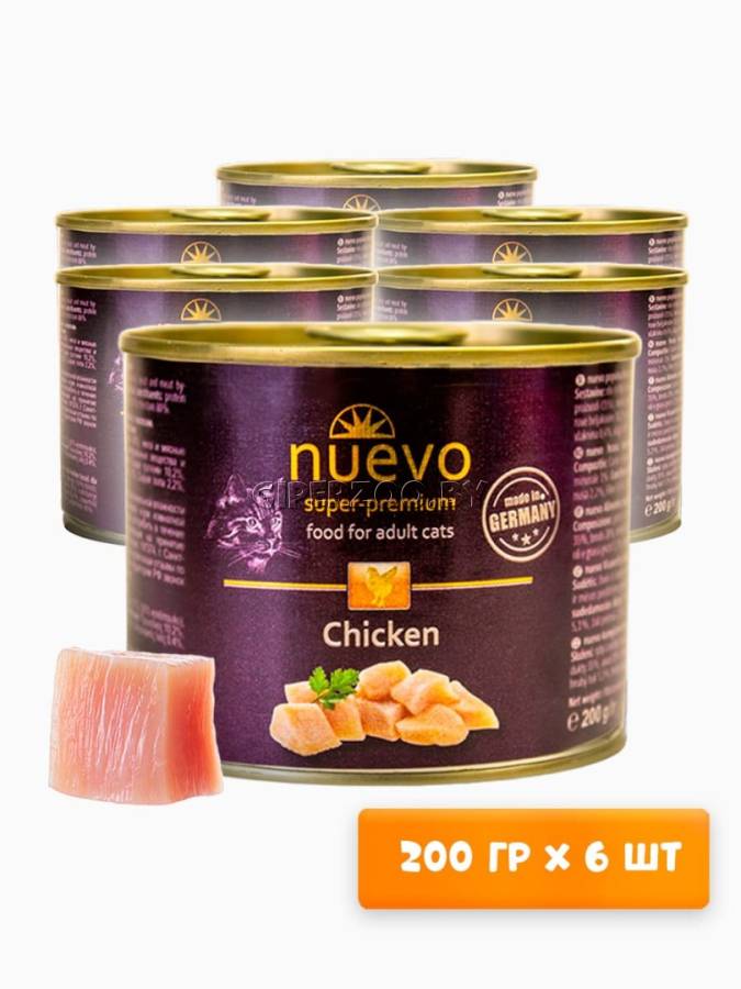 Консервированный корм для котов Nuevo Adult Cat (курица), 200 гр*6 шт – сбалансированный влажный корм для взрослых кошек, изготовленный из отборного мяса курицы. Корм обеспечивает полноценное питание, богатое белком и необходимыми витаминами для поддержания здоровья и активности вашего питомца.