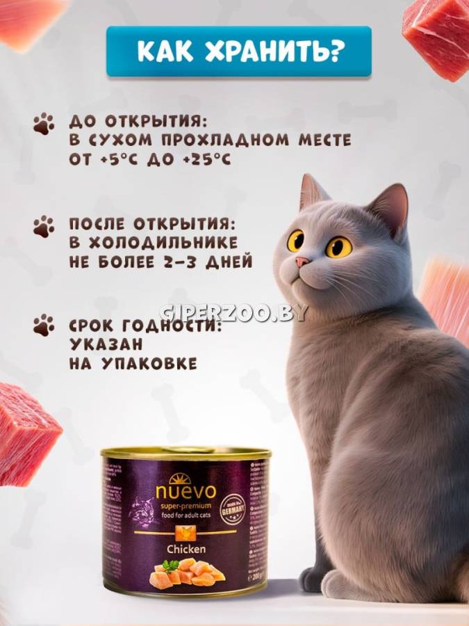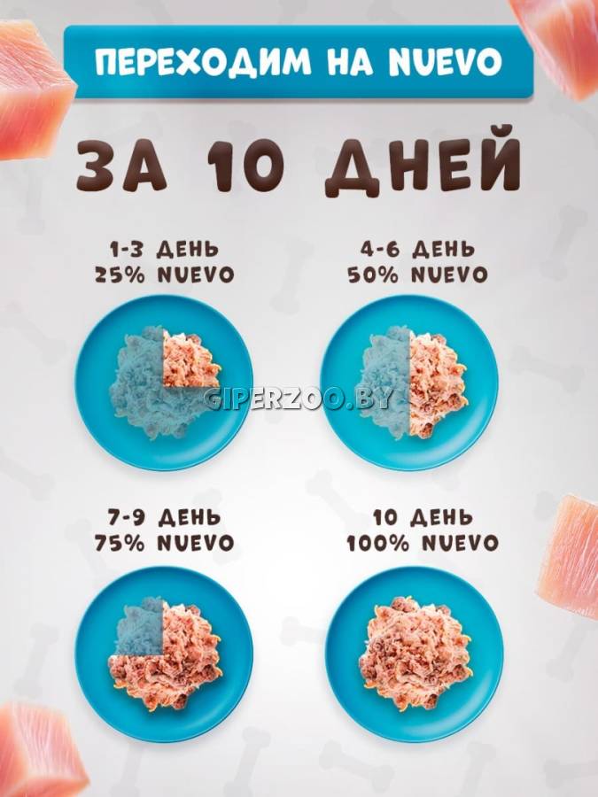 Рекомендации по применению: суточная норма зависит от веса и активности животного. Для разнообразия рациона можно комбинировать с сухим кормом Nuevo.