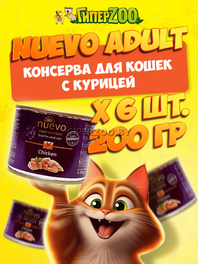 Nuevo консервы для взрослых кошек с курицей Характеристика nuevo Chicken — высокое сочетание мяса (71%), богатого ценным белком. Этот корм соответствует индивидуальным потребностям чувствительного кота, он содержит только свежее мясо в сочетании с необходимыми витаминами и минералами. nuevo Chicken — замечательный источник энергии, легко усваиваемый и очень вкусный. Состав: 32% курица, мясной бульон 27%, минеральные вещества 1%.