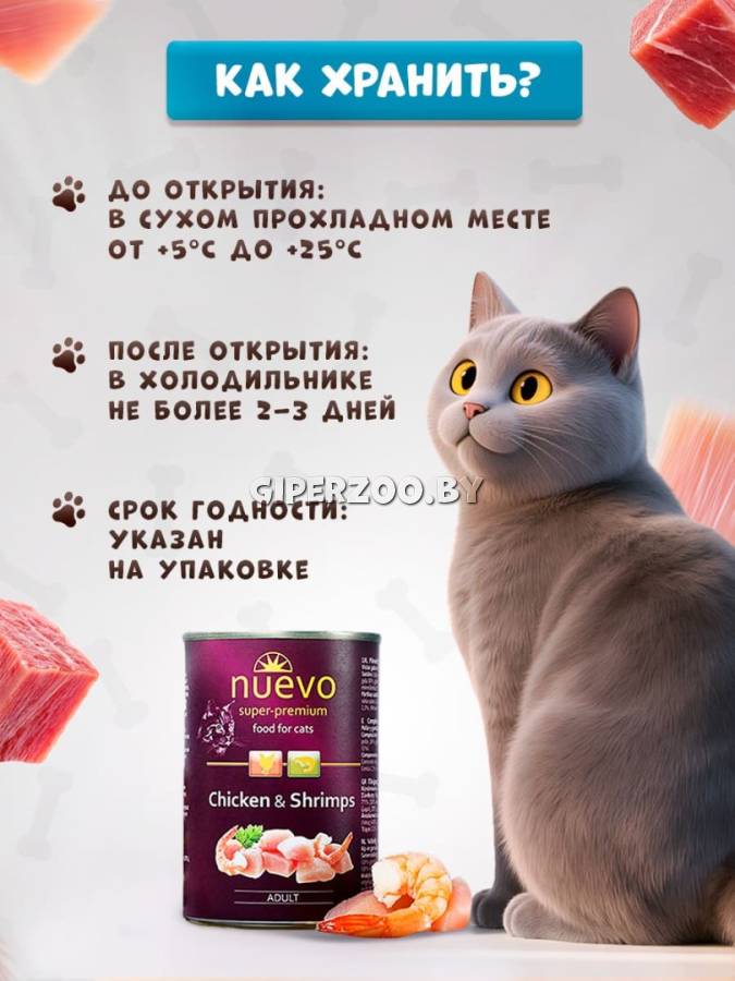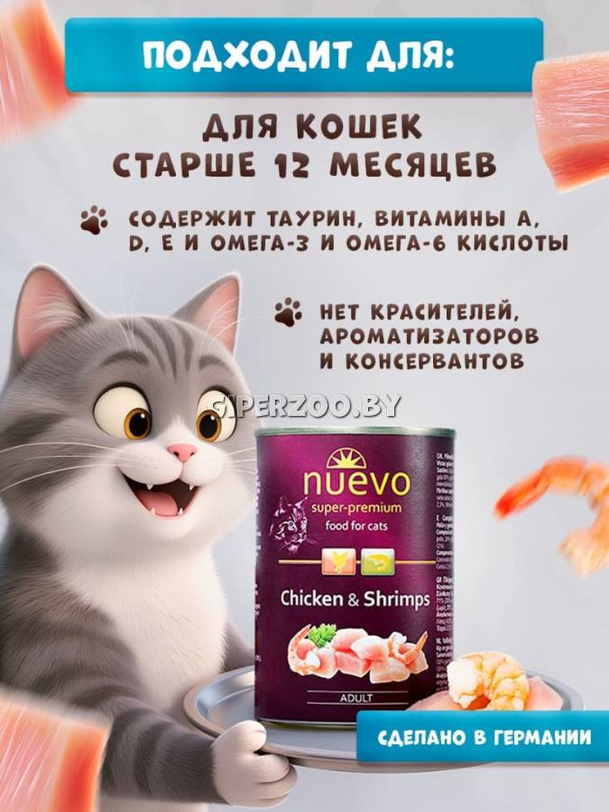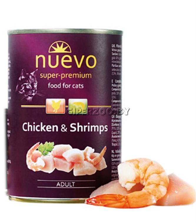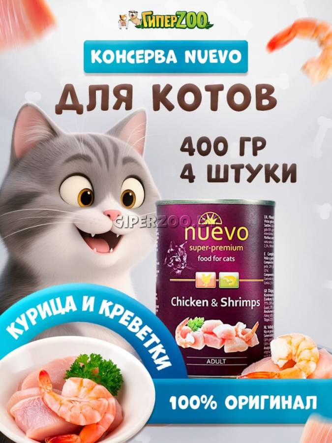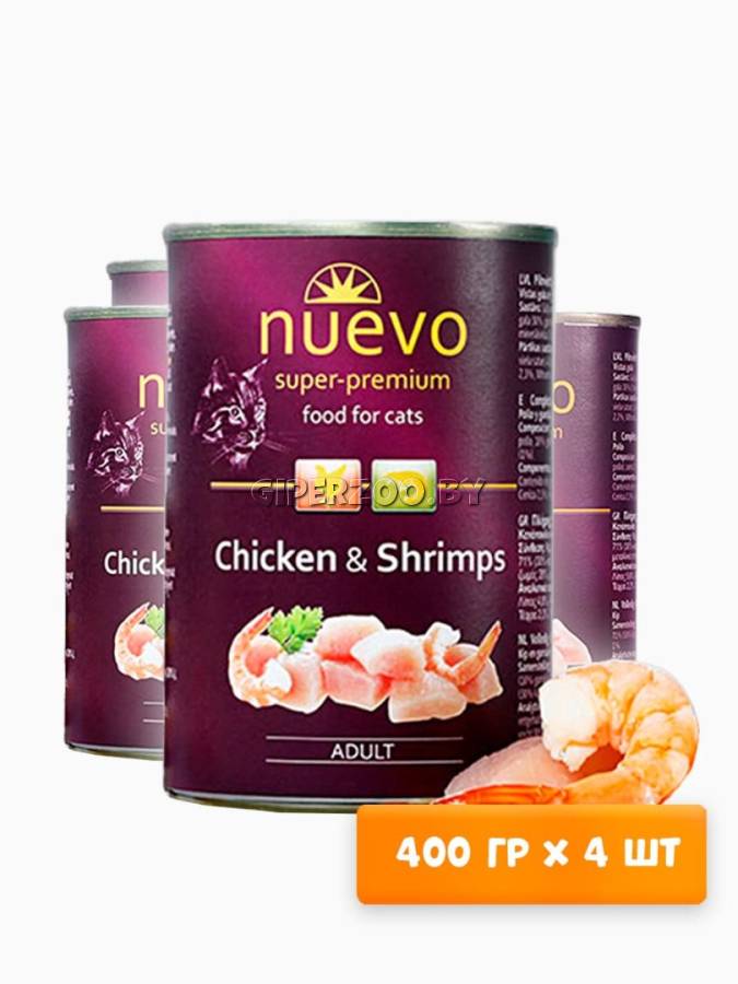 Консервированный корм Nuevo Adult Cat (курица, креветки), 400 гр*4 шт обеспечит вашего питомца всеми необходимыми питательными веществами. Отборное мясо курицы в сочетании с нежными креветками порадует даже самых избирательных и капризных кошек. Богатый источник белка и омега-кислот, корм поддерживает здоровье, активность и блестящую шерсть вашего питомца.