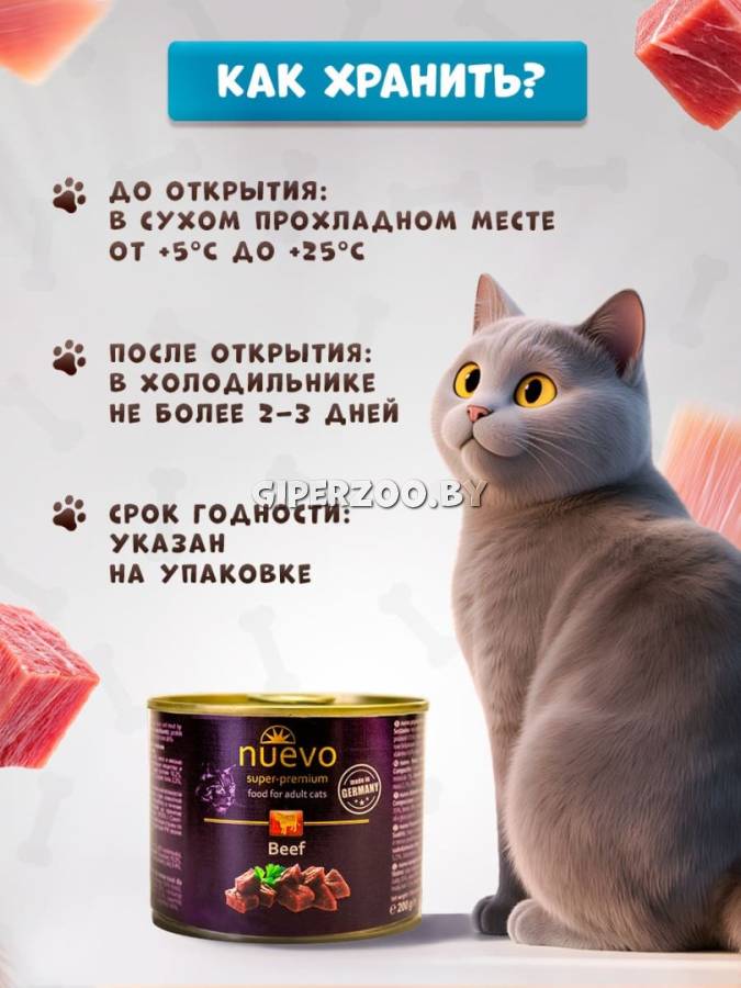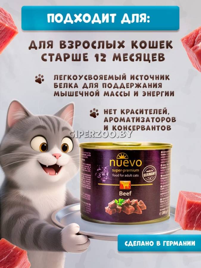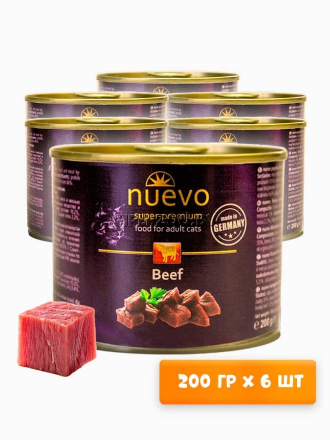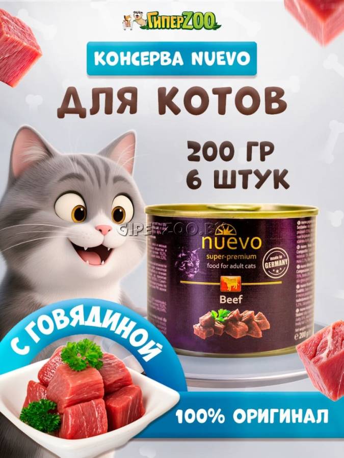 Консервы для взрослых кошек Nuevo Adult Cat (говядина), 200 гр*6 шт – сбалансированный влажный корм для взрослых кошек, изготовленный из высококачественной говядины. Богатый источник белка и необходимых питательных веществ, корм поддерживает здоровье, активность и отличное самочувствие вашего питомца.