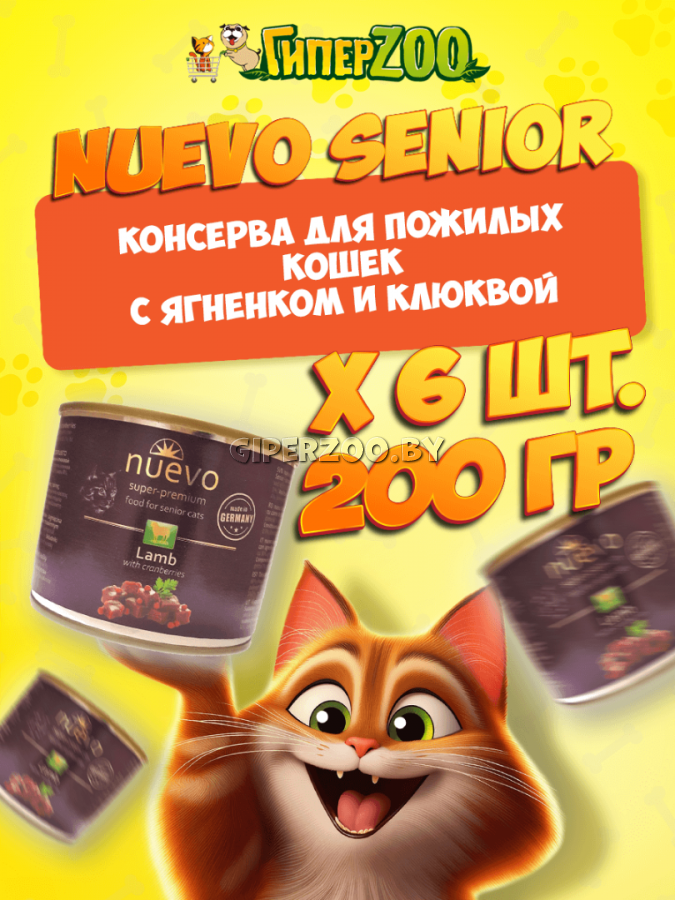 Консервы для кошек Nuevo Senior Cat (ягненок, клюква), 200 гр*6 шт – специализированный влажный корм для кошек старше 7 лет. Разработан с учетом потребностей пожилых животных: легкоусвояемый белок ягненка поддерживает мышечную массу, а клюква способствует здоровью мочевыводящих путей.