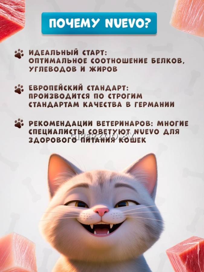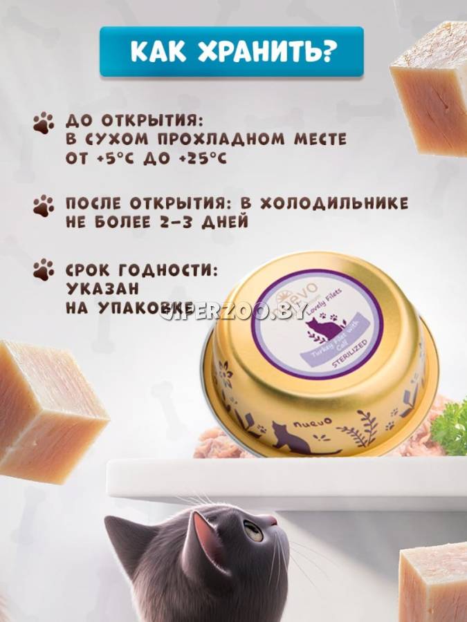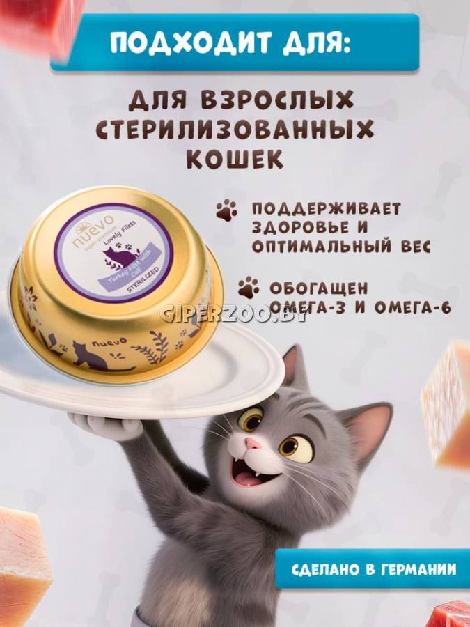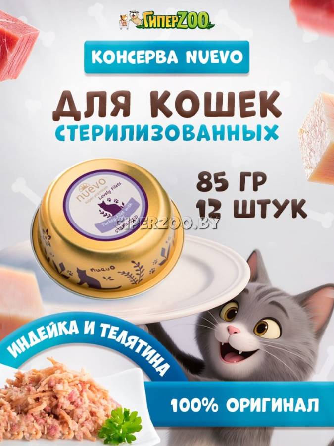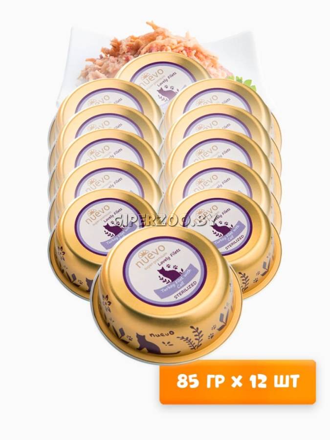 Влажный корм для кошек Nuevo Lovely filets Sterilised Cat (индейка, телятина), 85 гр*12 шт – это специально разработанный корм для стерилизованных кошек, который обеспечивает сбалансированное питание и поддерживает их здоровье и оптимальный вес. Нежные кусочки филе индейки и телятины делают этот корм не только вкусным, но и полезным для вашего питомца.