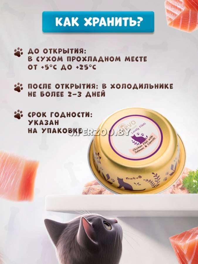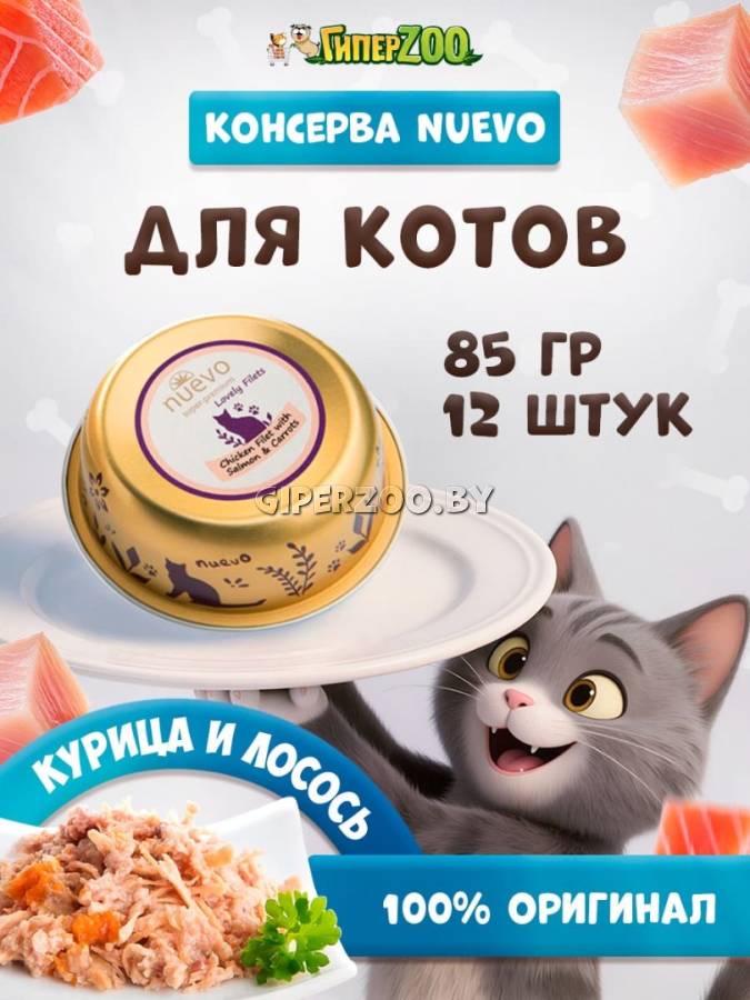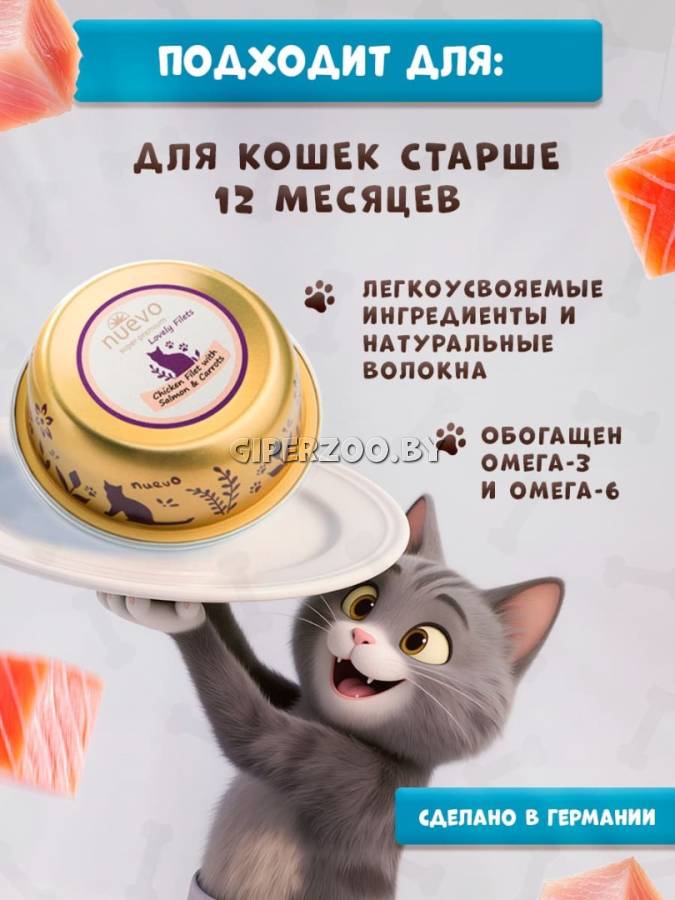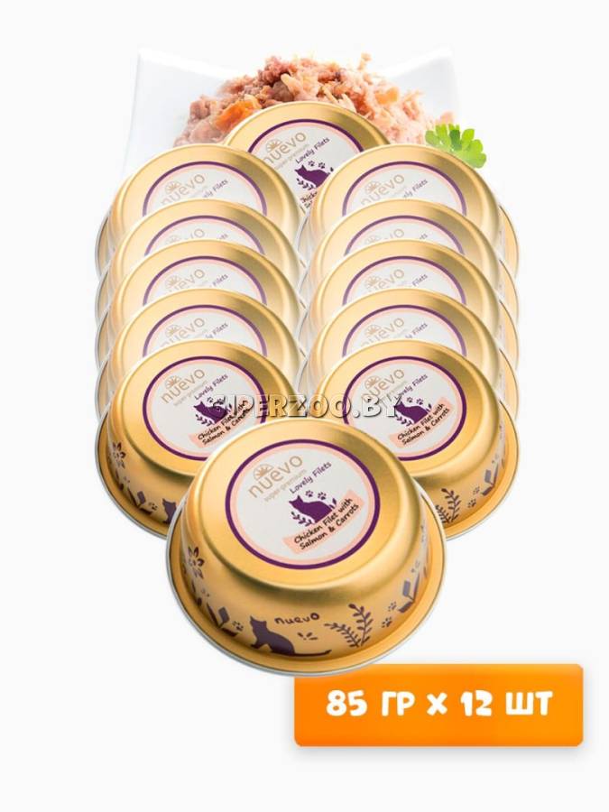 Влажный корм для кошек Nuevo Lovely filets Cat (курица, лосось), 85 гр*12 шт – супер-премиальный корм, который сочетает в себе высококачественные ингредиенты и изысканный вкус. Этот корм разработан для обеспечения сбалансированного питания и поддержания здоровья вашего питомца.