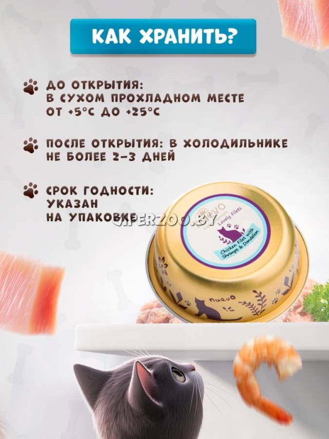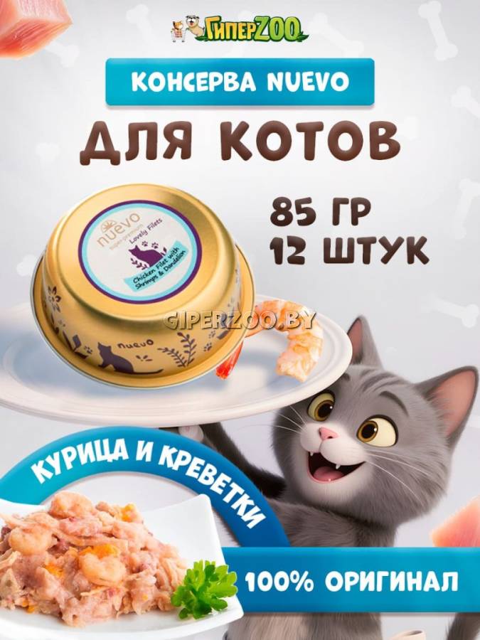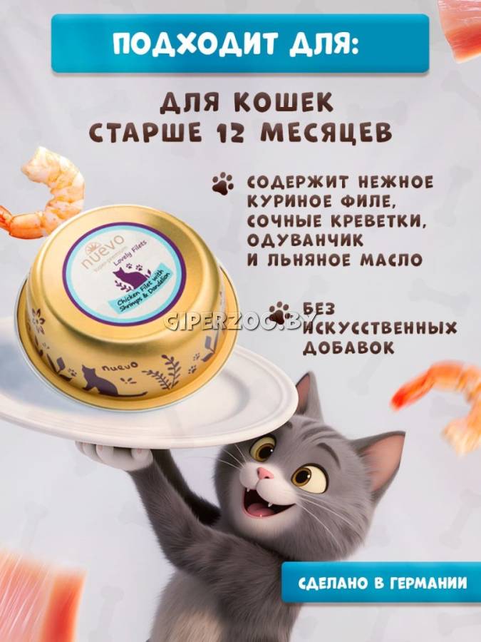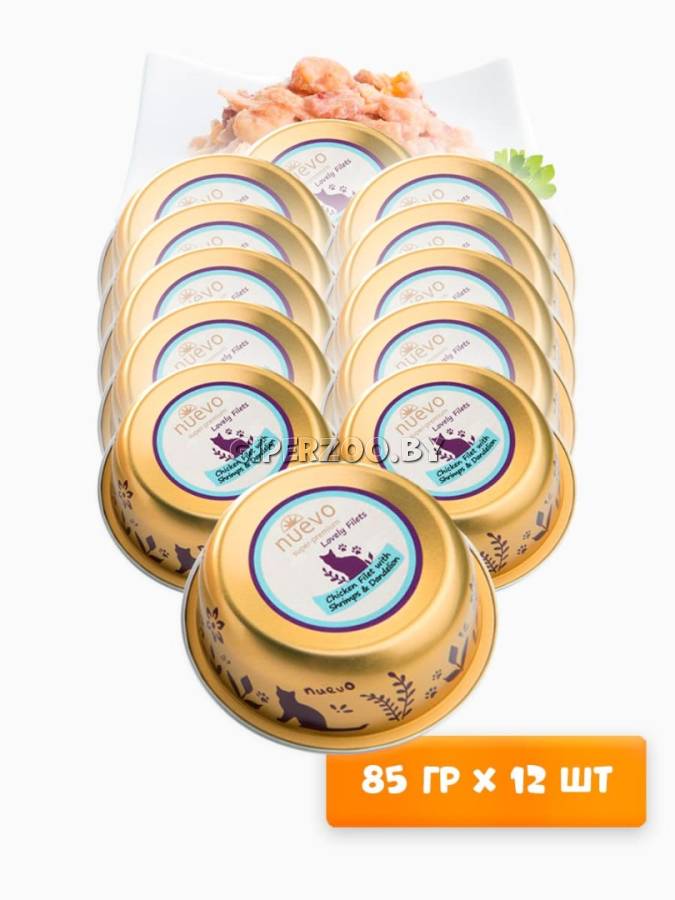 Консервированный корм для кошек Nuevo Lovely filets Cat (курица, креветки), 85 гр*12 шт – это сбалансированное питание для вашей кошки, созданное с любовью и заботой. Консервы супер-премиум класса содержат нежное куриное филе, сочные креветки, полезный одуванчик и льняное масло, богатое омега-кислотами. Этот вкусный и питательный рацион обеспечит вашего питомца необходимыми витаминами и минералами для поддержания здоровья и активности.