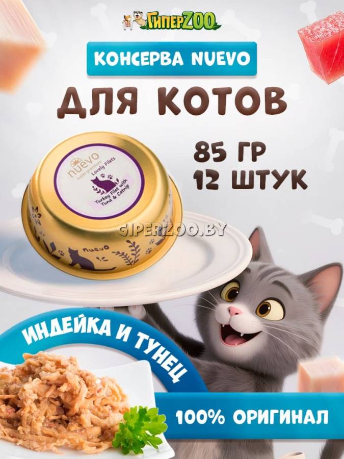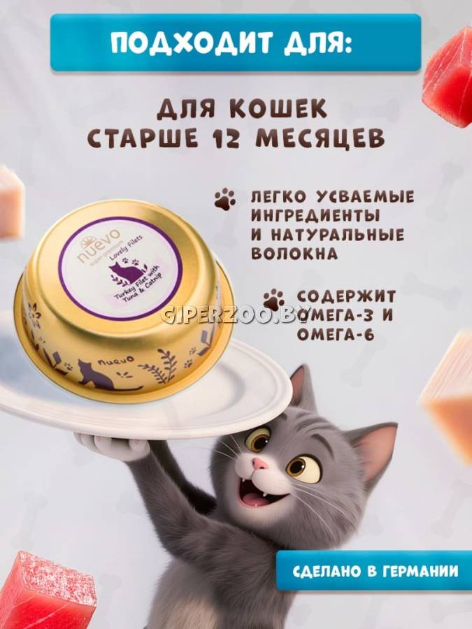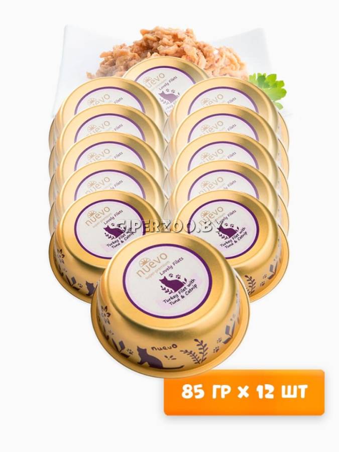 Влажный корм для кошек Nuevo Lovely filets Cat (индейка, тунец), 85 гр*12 шт – это супер-премиальный корм, который сочетает в себе нежные кусочки филе индейки и тунца. Корм разработан для обеспечения сбалансированного питания и удовлетворения вкусовых предпочтений вашего питомца.