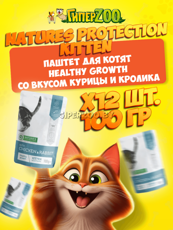 Nature's Protection Kitten для котят с курицей и кроликом пауч – консервированный полноценный корм высшего качества для котят с курицей и кроликом. Это специальный корм, помогающий гарантировать здоровый рост и развитие котят и молодых кошек. Корм упакован в удобные для пользования пакетики.