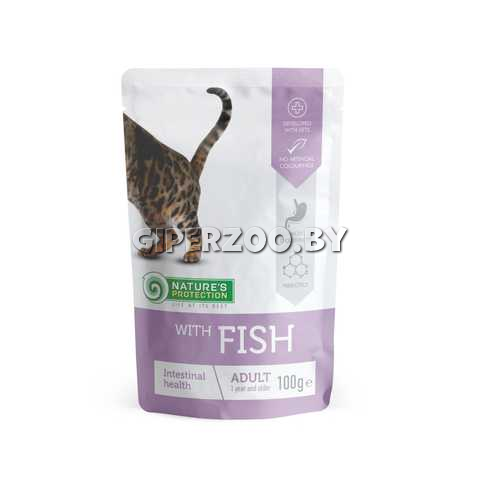 Nature's Protection Intestinal Health (рыба), 100 гр - консервы в пакетиках с рыбой для взрослых кошек с чувствительным пищеварением, гарантирует здоровую пищеварительную систему. Общее количество мяса – 50%.