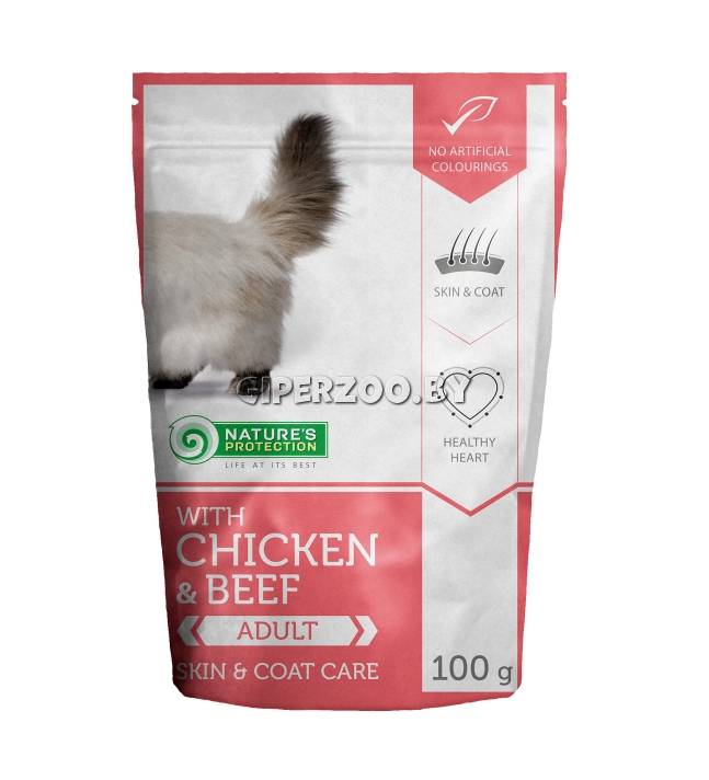 Natures Protection Skin&Coat Care (курица с говядиной), 100 гр - консервированный полнорационный корм высшего качества с курицей и говядиной, предназначенный для взрослых длинношерстных кошек, 100 гр. Это специальный продукт, который может помочь поддержать отличное состояние кожи и безупречную шерсть питомца. Корм выпускается в удобных для пользования пакетиках.