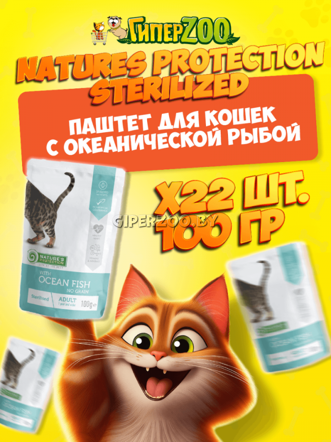 Nature's Protection Sterilized With Ocean Fish - высококачественный консервированный комплексный корм с океанической рыбой - отличный способ побаловать стерилизованных или страдающих ожирением кошек. Мягкий и легко пережевываемый корм, не содержащий зерна, поэтому он идеально подходит для аллергиков и кошек с непереносимостью зерновых культур. Кроме того, он хорошо усваивается. Океанская рыба ценится за ее противоаллергические свойства, она богата витаминами А и D. В ней мало сырого жира, поэтому консервы не нагружают пищеварительную систему питомца и помогают поддерживать оптимальный вес кошки после стерилизации/кастрации. Состав: Мясо и мясные продукты 33%, рыба и рыбные продукты 8% (4% морская рыба), овощные продукты (1% гороховой клетчатки), минеральные вещества. Аналитические составные части: сырой белок 9%, сырая клетчатка 0, 8%, сырой жир 4%, сырая зола 2%, влажность 82%. 100 гр.