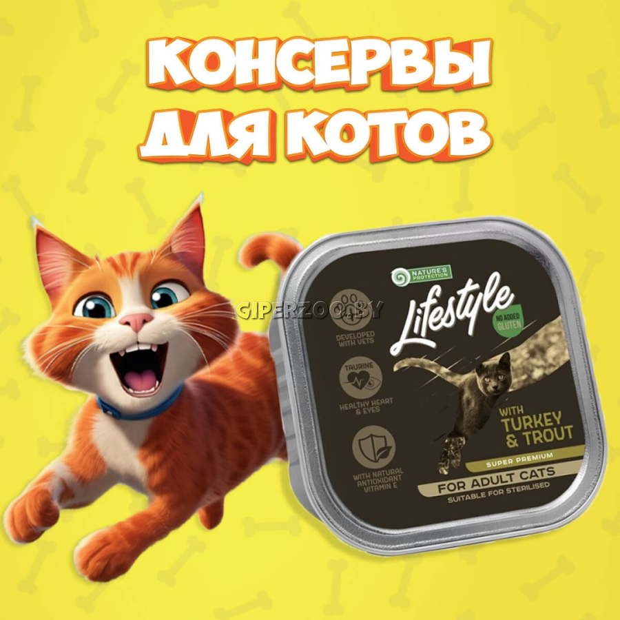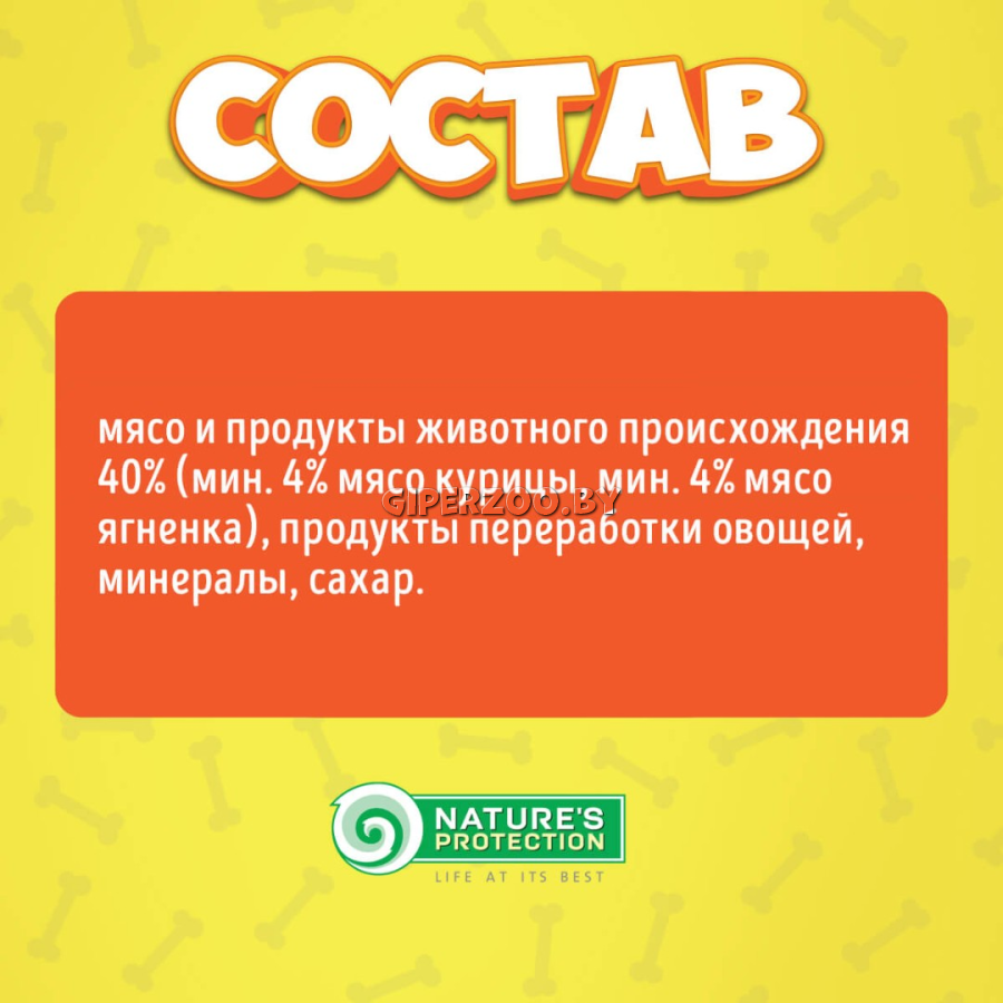 Консервы NATURE'S PROTECTION Lifestyle – высококачественные, натуральные, эксклюзивные ароматы, различные виды, предназначенные для удовлетворения потребностей различных домашних животных. Эти консервы не содержат искусственных красителей, антиоксидантов и усилителей вкуса. Содержат натуральные, полезные ингредиенты для организма животного. Консервы содержат всего 4,5% сырого жира, поэтому корм также подходит для тучных, страдающих избыточным весом и/или стерилизованных животных.Консервы не содержат глютен, поэтому они идеально подходят для домашних животных с чувствительной пищеварительной системой, непереносимостью или аллергией на глютен. Состав: мясо и продукты животного происхождения 40% (мин. 4% мясо курицы, мин. 4% мясо ягненка), продукты переработки овощей, минералы, сахар. Аналитические составные части: сырой белок – 9%, сырая клетчатка – 0,3%, необработанные жиры – 4,5%, сырая зола – 2%, влажность – 81%. 85 гр.
