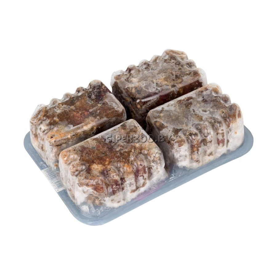 Глубокая заморозка. Для удобства кормления содержимое контейнера разделено на четыре брикета весом около 125 г каждый. Корм состоит из кусочков размером приблизительно 2 х 2 см, 1 х 1 см и фарша, который составляет около 15%.
