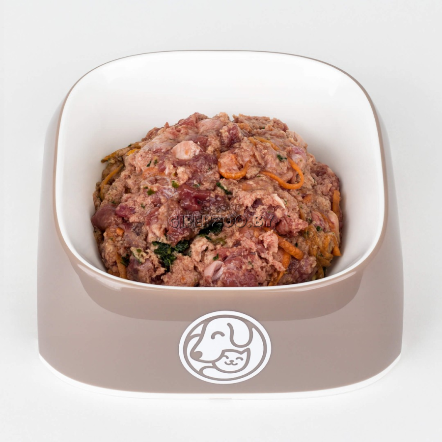 Глубокая заморозка. Для удобства кормления содержимое контейнера разделено на четыре брикета весом около 125 г каждый. Корм состоит из кусочков размером приблизительно 2 х 2 см, 1 х 1 см и фарша, который составляет около 30%.