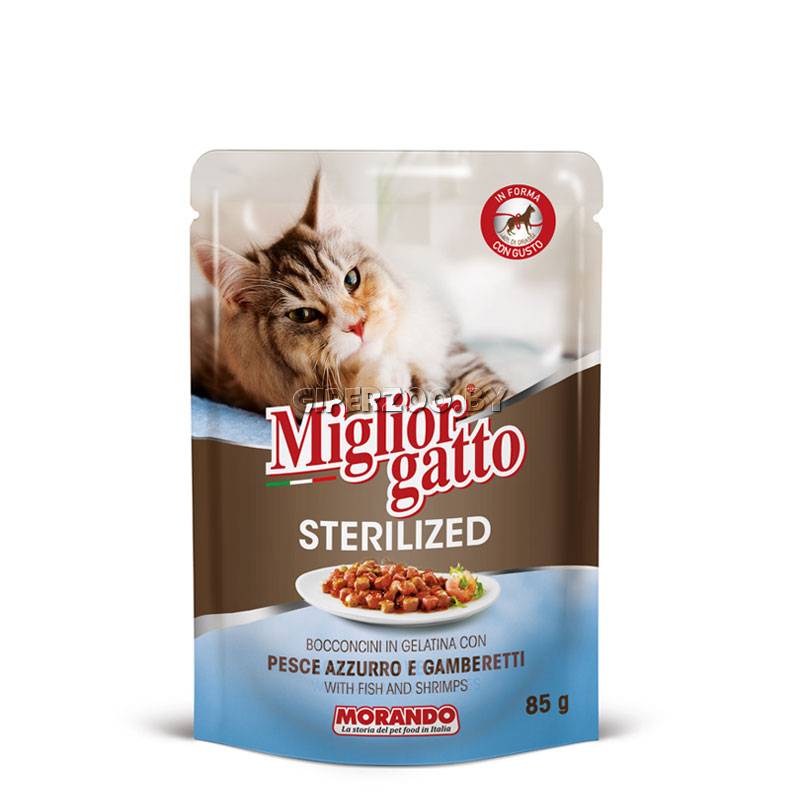 Migliorgatto Sterilized кусочки с рыбой и креветками — это беззерновой влажный корм, специально разработанный для стерилизованных кошек, склонных к набору лишнего веса и имеющих повышенный риск проблем с мочевыводящей системой. Благодаря сбалансированной формуле, этот корм помогает поддерживать оптимальный вес вашего питомца, снижая риск образования камней и других опасных заболеваний.