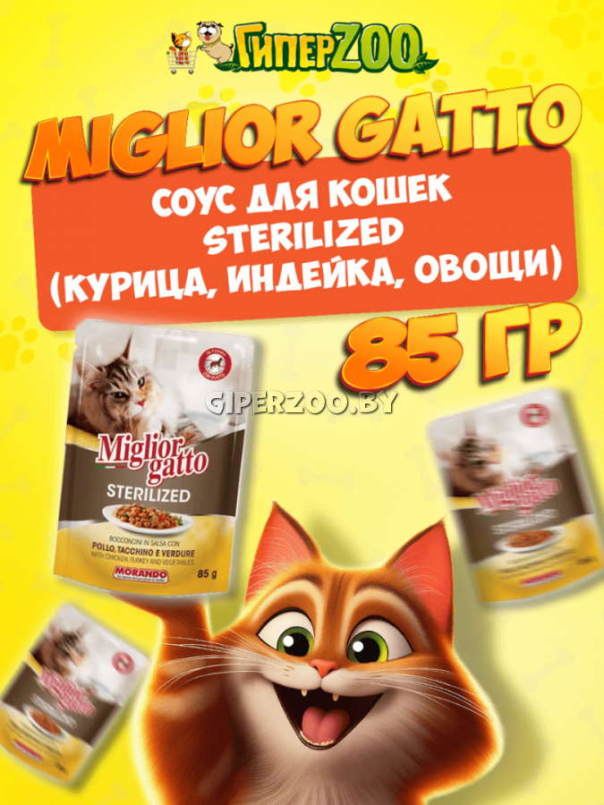 Вкусные маленькие кусочки в соусе от Migliorgatto Sterilized предлагают вашей кошке влажный корм с непревзойденным вкусом.
