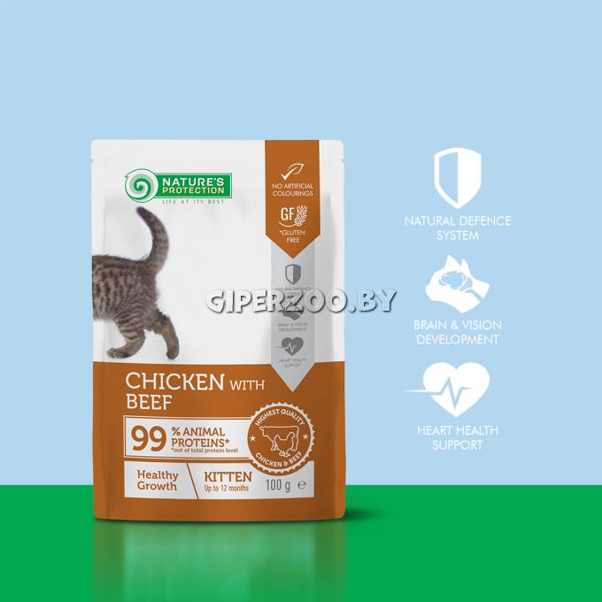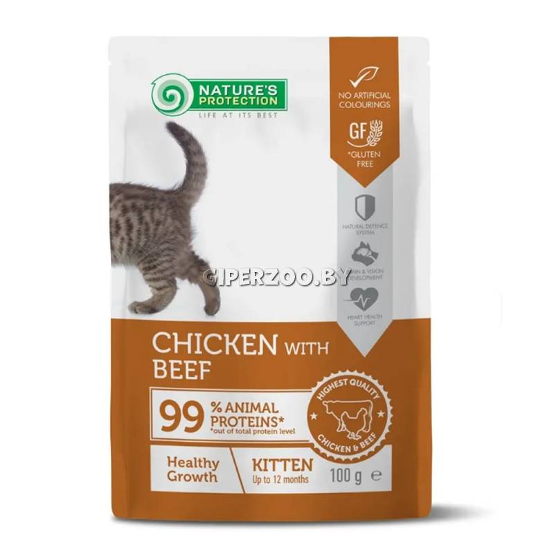 Nature's Protection Kitten Healthy Growth (курица, говядина), 100 гр - это супер-премиум полнорационный влажный корм для котят с курицей и говядиной во вкусном соусе, дополненный минералами.