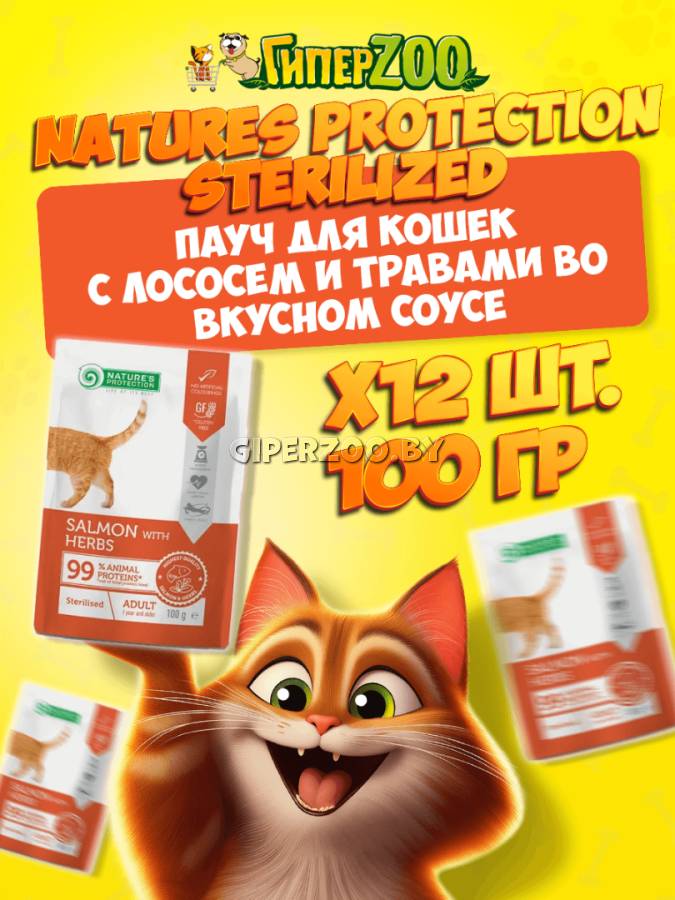 Nature's Protection Sterilized (лосось и травы), 100 гр*12 шт – это супер-премиум полнорационный влажный корм для взрослых стерилизованных кошек с лососем и травами во вкусном соусе, дополненный минералами.