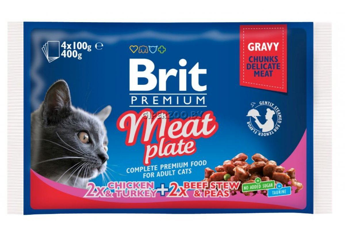 Ассорти влажных кормов для кошек в паучах Brit Meat Plate (Брит Мясная тарелка), 4*100 гр - содержит 4 упаковки влажного корма класса премиум для взрослых кошек.