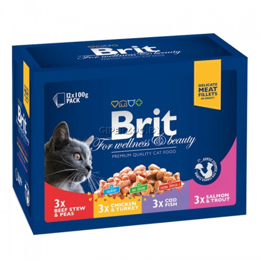 Консервы для кошек BRIT Family Plate 0,1 кг 12 штук (100313) содержит набор из 12 упаковок влажного корма класса премиум для взрослых кошек. Кусочки с рагу из говядины и горошком - 3 штуки. Состав: 74% мясо и мясные субпродукты (говядина 8%), субпродукты растительного происхождения (инулин 0,4%), овощи (горох 4%), минеральные вещества. Не содержит красителей и консервантов. Аналитический состав: белки 8,5%, жиры 4,5%, зола 2,5%, клетчатка 0,4%, влага 82%. Кусочки c курицей и индейкой - 3 штуки. Состав: 78% мясо и мясные субпродукты (курица 8%, индейка 8%), субпродукты растительного происхождения (инулин 0,4%), минеральные вещества. Не содержит красителей и консервантов. Аналитический состав: белки 8,5%, жиры 4,5%, зола 2,5%, клетчатка 0,4%, влага 82%. Кусочки с треской - 3 штуки. Состав: 60% мясо и мясные субпродукты, 16% рыба и рыбные субпродукты (треска 8%), субпродукты растительного происхождения (инулин 0,4%), минеральные вещества. Не содержит красителей и консервантов. Аналитический состав: белки 8,5%, ж
