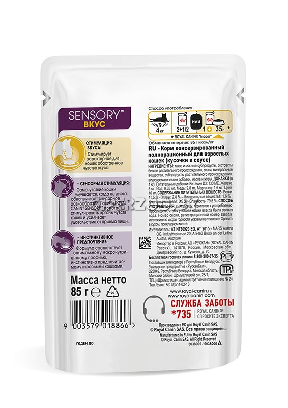 Хорошее самочувствие кошек улучшается, если в их рационе есть сенсорные вариации. ROYAL CANIN® SENSORY стимулирует чувства кошек и улучшает их опыт кормления. Разработано для соответствия оптимальному профилю макроэлементов, который инстинктивно предпочитают взрослые кошки. Стимулирует особые вкусовые качества кошек.