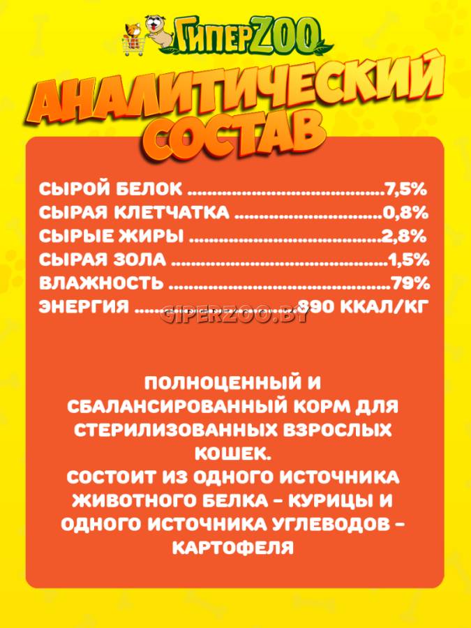 Ингредиенты: курица (печень 36%, свежее мясо курицы 20%), бульон из курицы, картофель (4%) дрожжевые продукты (2%), минеральные соли, гороховая клетчатка (0,5%), Юкка Шидигера (0,025%).