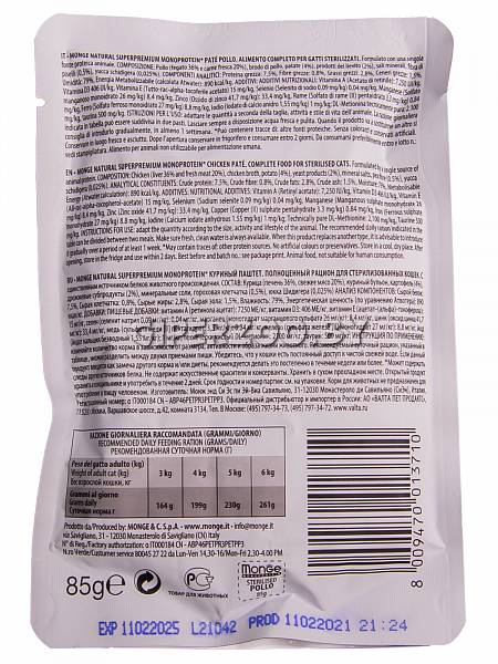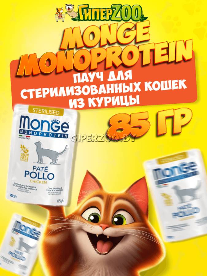 Консервированный корм Monge Monoprotein Pollo, 85 гр - паучи для стерилизованных кошек с курицей, полноценный сбалансированный рацион из мяса курицы для стерилизованных кошек с особыми потребностями. В состав паштета входят один источник белка животного происхождения и один источник углеводов, такой как картофель.