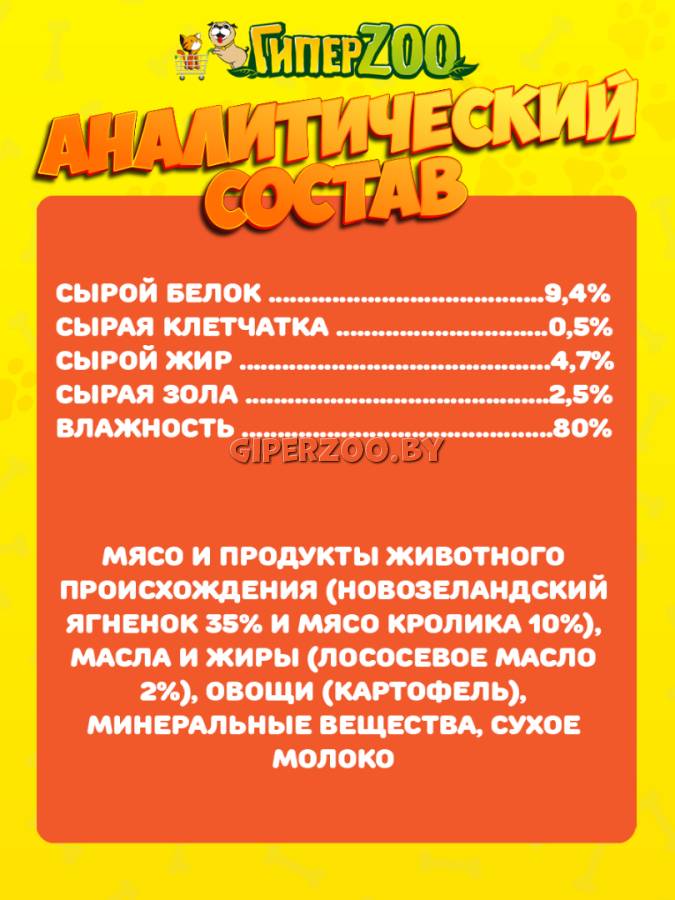 Мясо и мясные субпродукты (новозеландский ягненок 35%, мясо кролика 10%), рыбий жир (лососевое масло 2%), овощи (картофель), минералы, сухой молочный белок.