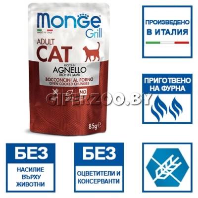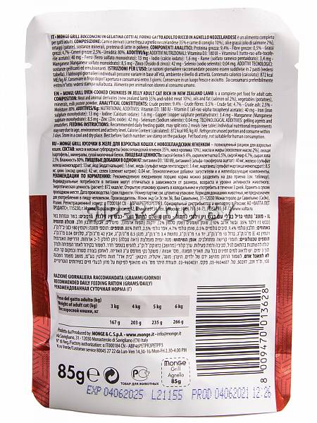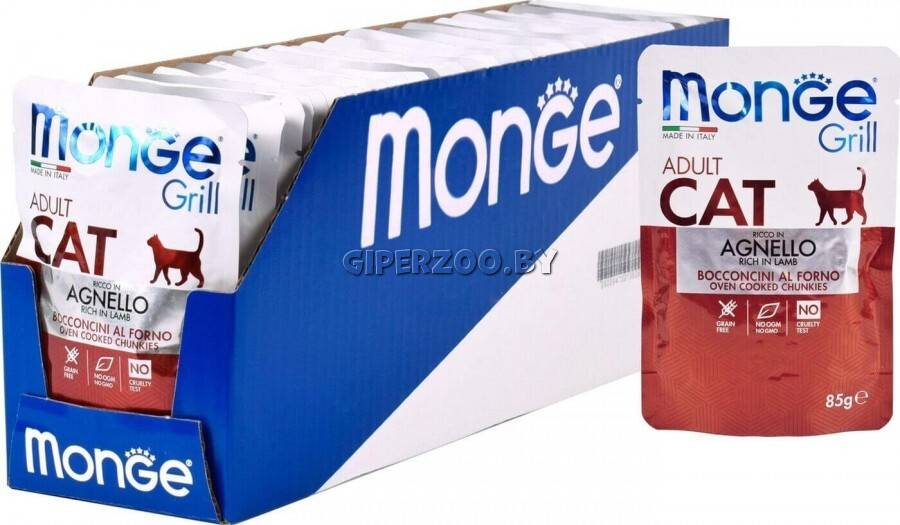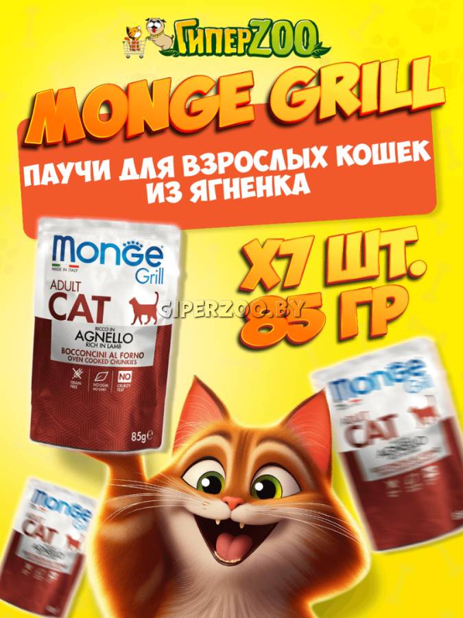 Влажный корм для котов Monge Cat Grill Pouch Lamb (желе, ягненок), 85 гр*7 шт - это консервированный корм для взрослых котов с кусочками ягненка в желе. Кусочки в желе характеризуются твердой текстурой и приятным ароматом, характерным для вареного мяса.