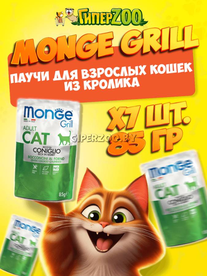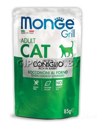 Monge Cat Grill Pouch Adult Rabbit - это консервированный корм для кошек с кусочками кролика в желе.