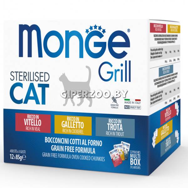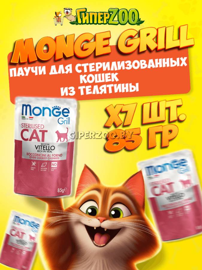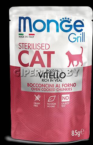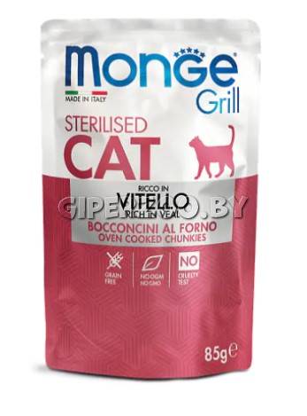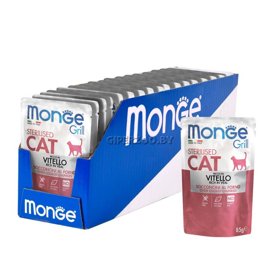 Влажный корм для кошек Monge Cat Grill Pouch Adult Sterilised Veal, 85 гр*7 шт - это консервированный корм для кошек с кусочками телятины в желе. Новая линейка влажных рационов MONGE GRILL CAT разработана с учётом физиологических потребностей кошек.