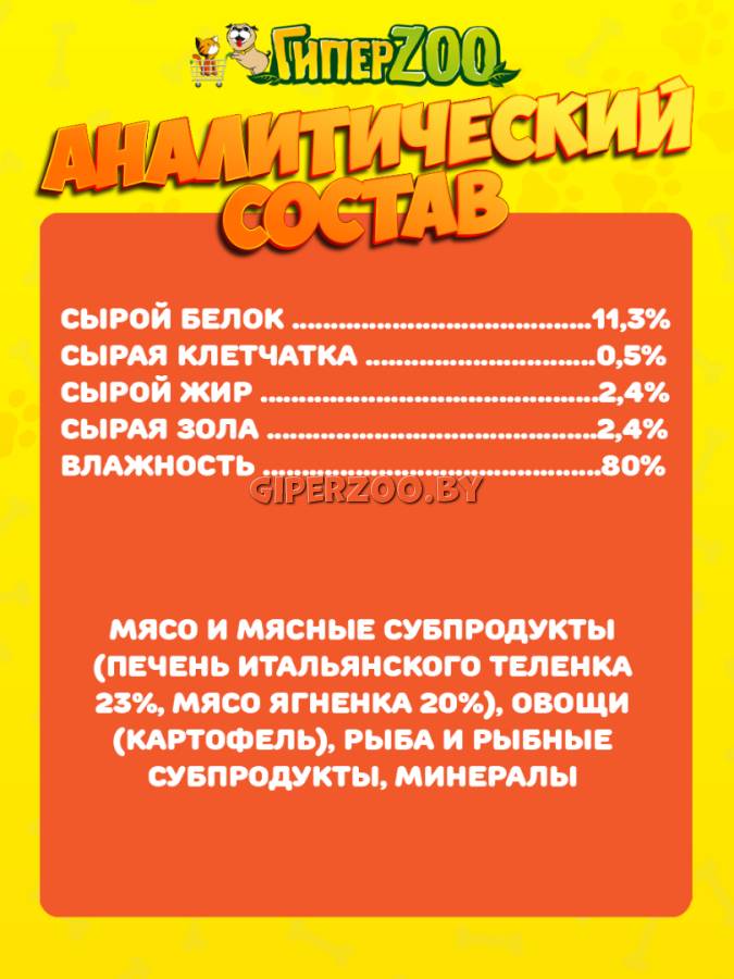 Ингредиенты: мясо и мясные субпродукты (печень итальянского теленка 23%, мясо ягненка 20%), овощи (картофель), рыба и рыбные субпродукты, минералы.