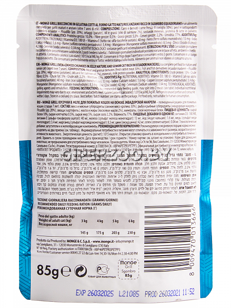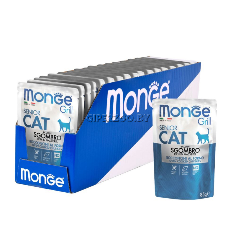 Влажный корм для котов Monge Cat Grill Pouch Senior Mackerel (желе, скумбрия), 85 гр*7 шт- это консервированный корм для котов с кусочками скумбрии в желе.