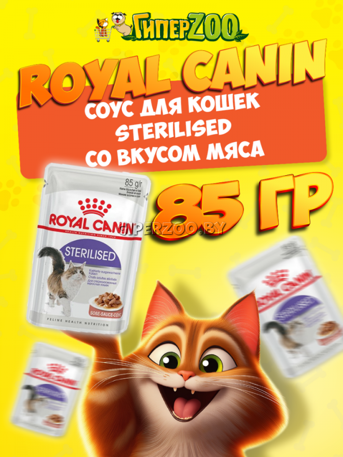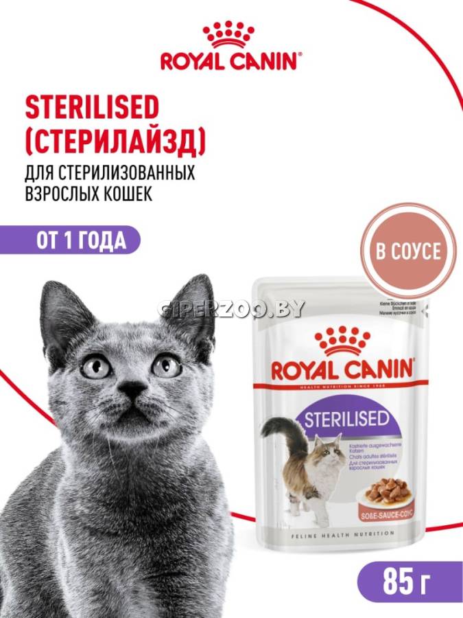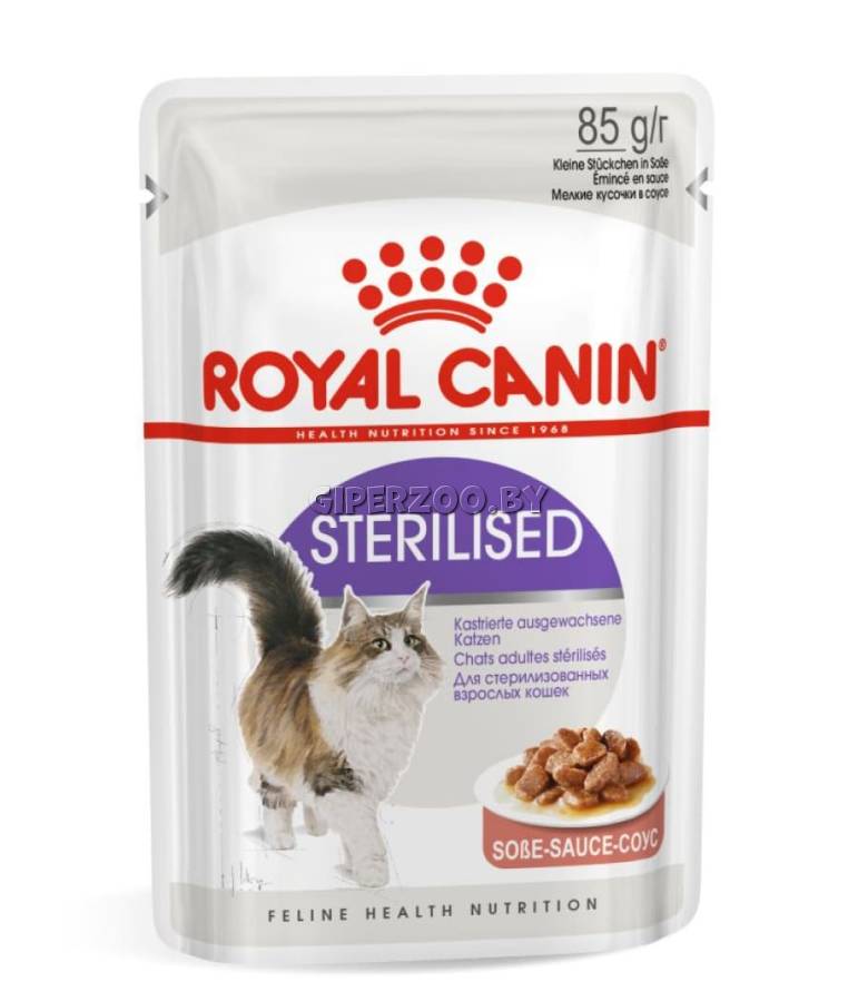 Консервированный корм в паучах Royal Canin STERILISED (соус), 85 гр - корм консервированный полнорационный для стерилизованных взрослых кошек (мелкие кусочки в соусе). Благодаря контролируемому уровню калорийности и умеренному содержанию жиров Sterilised в соусе помогает кошке не набирать избыточный вес (при условии, что при кормлении не превышается рекомендуемый объем порций).