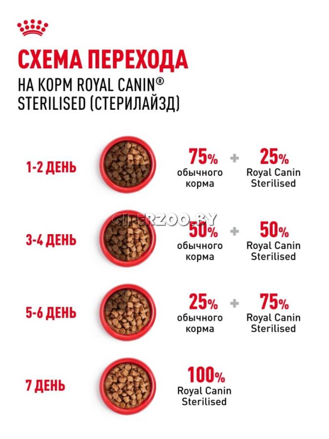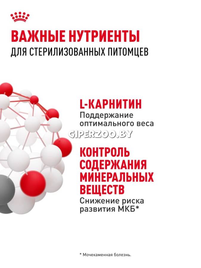 Стерилайзд: влажный корм для стерилизованных взрослых кошек. После кастрации или стерилизации энергетические потребности кошки снижаются на 30%, притом что потребление корма может возрасти на 20%. Кусочки в соусе для кастрированных/стерилизованных кошек с тенденцией к полноте, в возрасте от 1 до 7 лет.