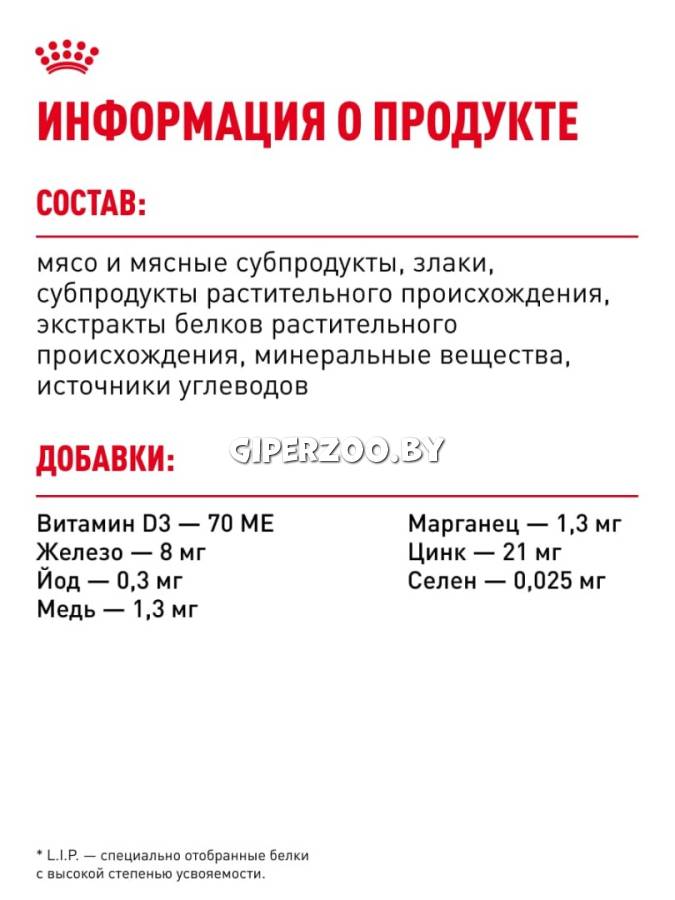 ИНГРЕДИЕНТЫ: мясо и мясные субпродукты, злаки, субпродукты растительного происхождения, экстракты белков растительного происхождения, минеральные вещества, источники углеводов.