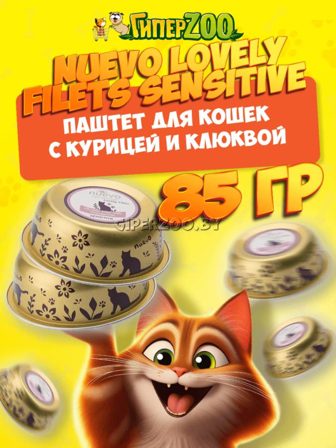 Влажный корм для кошек Nuevo Lovely Filet Sensitive (Куриное филе с клюквой) — супер-премиальные консервы для взрослых кошек с чувствительным пищеварением с куриным филе, клюквой и льняным маслом.