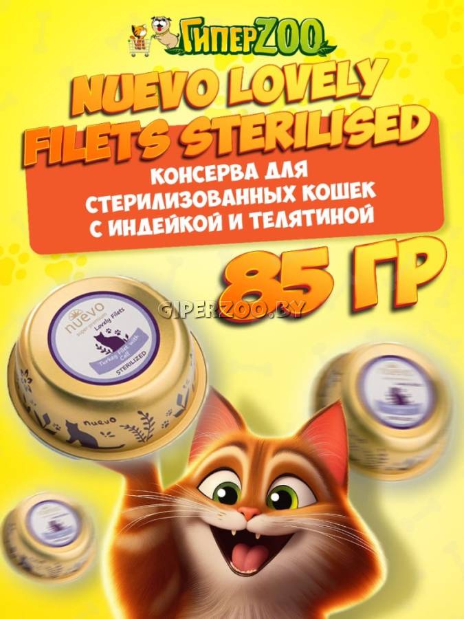 Влажный корм для кошек Nuevo Lovely filets Sterilised Cat (индейка, телятина), 85 гр – это специально разработанный корм для стерилизованных кошек, который обеспечивает сбалансированное питание и поддерживает их здоровье и оптимальный вес. Нежные кусочки филе индейки и телятины делают этот корм не только вкусным, но и полезным для вашего питомца.