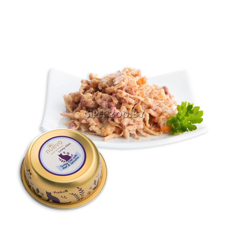 Влажный корм для кошек Nuevo Lovely filets Cat (филе индейки, говядина), 85 гр – это идеальный выбор для тех, кто ценит натуральность и превосходный вкус! Эти нежные кусочки филе станут любимым лакомством вашего питомца благодаря: