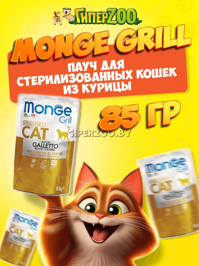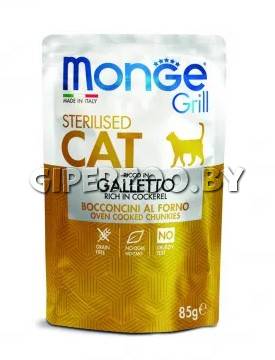 Monge Cat Grill Pouch Sterilised Galletto - это консервированный корм для кошек с кусочками птицы в желе. Новая линейка влажных рационов MONGE GRILL CAT разработана с учётом физиологических потребностей кошек.