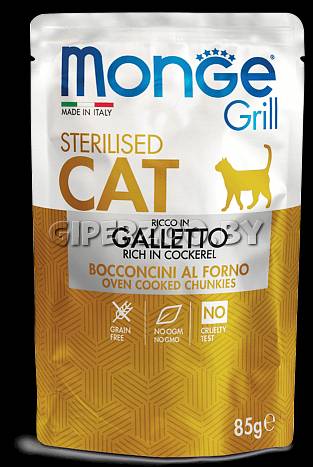 Monge Cat Grill Pouch Sterilised Galletto - это консервированный корм для кошек с кусочками птицы в желе. Новая линейка влажных рационов MONGE GRILL CAT разработана с учётом физиологических потребностей кошек. Омега-3 и омега-6 жирные кислоты для красоты шерсти и здоровья кожи. Оптимальный баланс омега-3 и омега-6 в составе корма чрезвычайно важен для поддержания кожи и шерсти в отличном состоянии. Рацион содержит важнейшие антиоксиданты, такие как витамин Е, для поддержания иммунной системы. Grain free formula - не содержит зерновых культур.