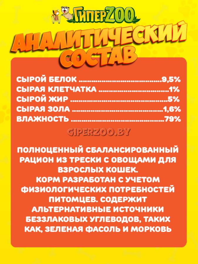 Сбалансированный полнорационный беззерновой корм из трески с овощами, который разработан с учётом физиологических особенностей стерилизованных кошек.