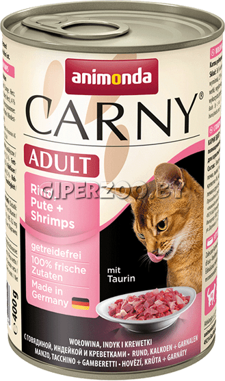 Animonda Carny Adult Cat - Beef, Turkey Shrimps− уникальные полнорационные корма суперпремиум класса для взрослых кошек. Отборное 100% свежее мясо гарантирует непревзойденный вкус, который так ценят кошки. Консервы Carny разработаны с привлечением профессиональных диетологов и обеспечивают взрослых кошек всеми жизненно важными питательными веществами.
