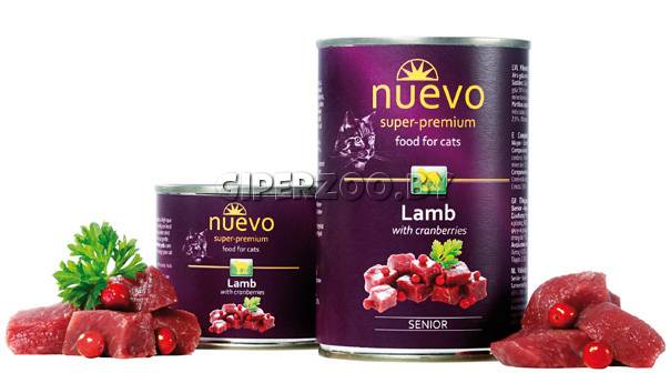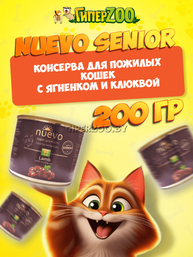 Консервы для кошек Nuevo Senior Cat (ягненок, клюква), 200 гр — специализированный влажный корм для кошек старше 7 лет. Разработан с учетом потребностей пожилых животных: легкоусвояемый белок ягненка поддерживает мышечную массу, а клюква способствует здоровью мочевыводящих путей.
