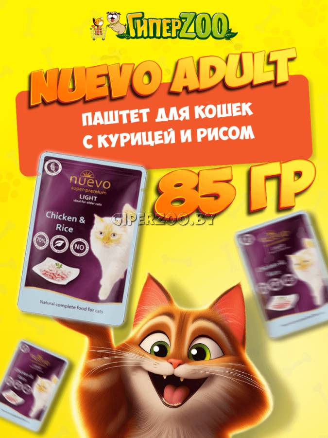 Nuevo Light Chicken & Rice cat, 85 гр - полноценный консервированный корм с курятиной и рисом. Это отлично сбалансированная консервированная еда для кошек, разработанная по рекомендациям ветеринаров. Рецептура Nuevo Light специально разработана для кошек склонных к избыточному весу. В нем низкое содержание жиров и низкий уровень белка. Меньшее количество калорий поможет контролировать вес без вреда здоровью. Состав: мяса 64% (40% мяса курицы, 24% мяса домашней птицы), 29% бульон, 3% риса, 3% целлюлозы, 1% минералов. Для кошек с лишним весом
