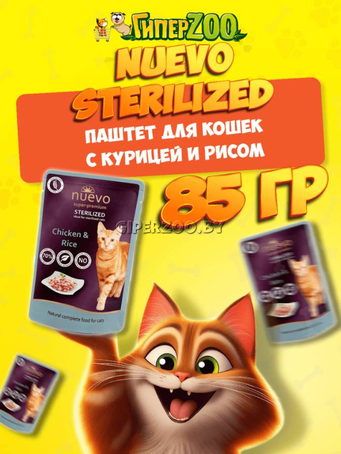 Nuevo Sterilized Chicken & Rice cat, 85 гр - полноценный консервированный корм с курятиной и рисом, разработан специально для кастрированных кошек. Это отлично сбалансированная консервированная еда для кошек, разработанная по рекомендациям ветеринаров. Состав: мяса 71% (30% говядины), бульон 28%, минералы 1%. Для кошек после стерилизации