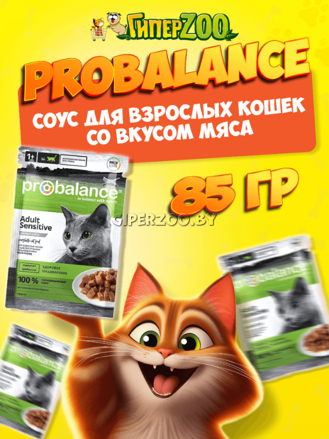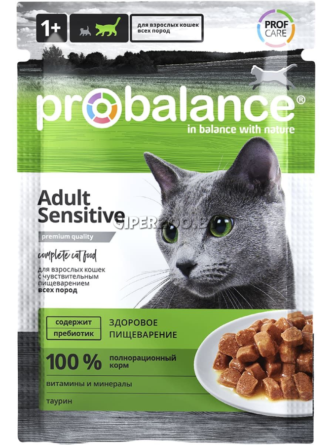 ProBalance Консервированный корм Sensitive Cat - полнорационный сбалансированный консервированный корм премиум класса для взрослых кошек всех пород с чувствительным пищеварением. ProBalance® Sensetive предназначен для ежедневного кормления взрослых кошек всех пород с чувствительным пищеварением. Специальный пребиотик, добавленный в корм, способствует росту полезной микрофлоры кишечника, облегчает пищеварение и полноценное усвоение пищи. Широкий ингредиентный состав высокого качества обеспечивает кошку всеми необходимыми питательными веществами. Корм обогащен витаминами, минералами и аминокислотами. Все формулы кормов содержат таурин – незаменимую аминокислоту для организма кошек. Высокие потребности в белке обеспечиваются за счет качественного и разнообразного ингредиентного состава. Корма ProBalance® - это баланс вкуса и пользы. Консервированные корма ProBalance® не содержат ГМО, красителей и консервантов. Специально подобранное сырье и строгие требования к п