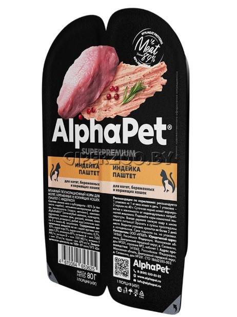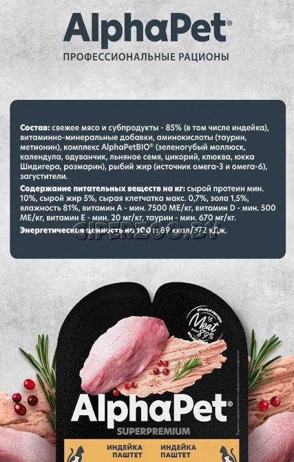 Состав: свежее мясо и субпродукты - 85% (в том числе индейка), витаминно-минеральные добавки, аминокислоты (таурин, метионин), комплекс AlphaPetBIO® (зеленогубый моллюск, календула, одуванчик, льняное семя, цикорий, клюква, юкка Шидигера, розмарин), рыбий жир (источник омега-3 и омега-6), загустители.