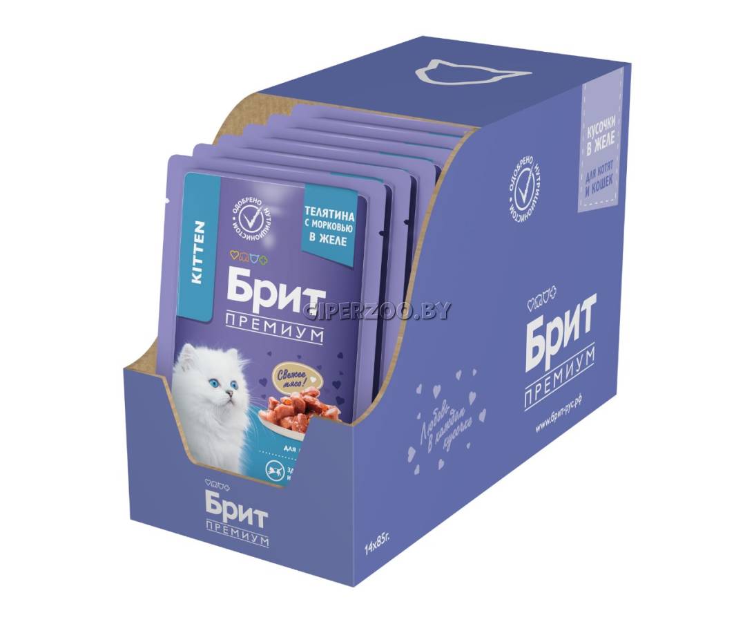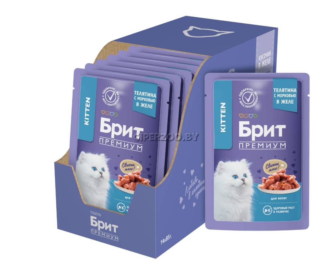 Брит Премиум Пауч для котят с телятиной и морковью в желе Cat Kitten (Brit Premium) - полнорационный влажный корм премиум класса для котят. Нежные кусочки телятины с сочной морковью в аппетитном желе - идеальное сочетание для полноценного и сбалансированного рациона.