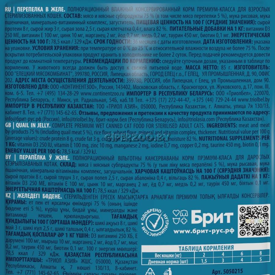 Питательные добавки на 1 кг: витамин D3 250 МЕ, витамин Е 100 мг, цинк 10 мг, марганец 2 мг, йод 0,7 мг, медь 0,2 мг, таурин 450 мг, биотин 0,1 мг.