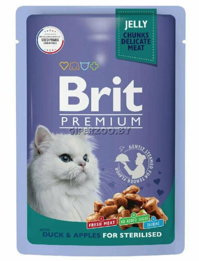 Полнорационный влажный корм премиум-класса Brit Premium Пауч для взрослых стерилизованных кошек с уткой и яблоками в желе, 85гр предлагает идеальное сочетание вкуса и пользы, разработанное с учетом особых потребностей стерилизованных кошек. Нежные кусочки утки в аппетитном желе с добавлением сочных яблок обеспечивают полноценный и сбалансированный рацион, который понравится даже самым привередливым питомцам.